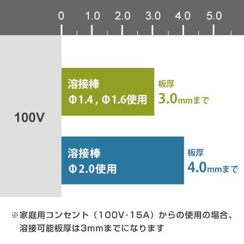 家庭用コンセント100V15Aを使用して、板厚0.8mm〜3.0mmまでの溶接ができます。