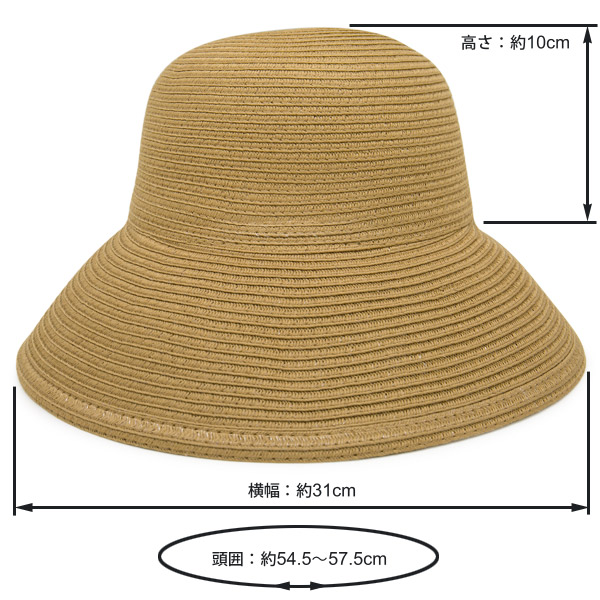 | サイズ | サイズ表記54.5〜57.5cm(頭囲:約54.5〜57.5cm[紐でサイズ調整可能]、高さ:約10cm、横幅:約31cm[つばも含む]、つばの長さ:約9.5cm) |