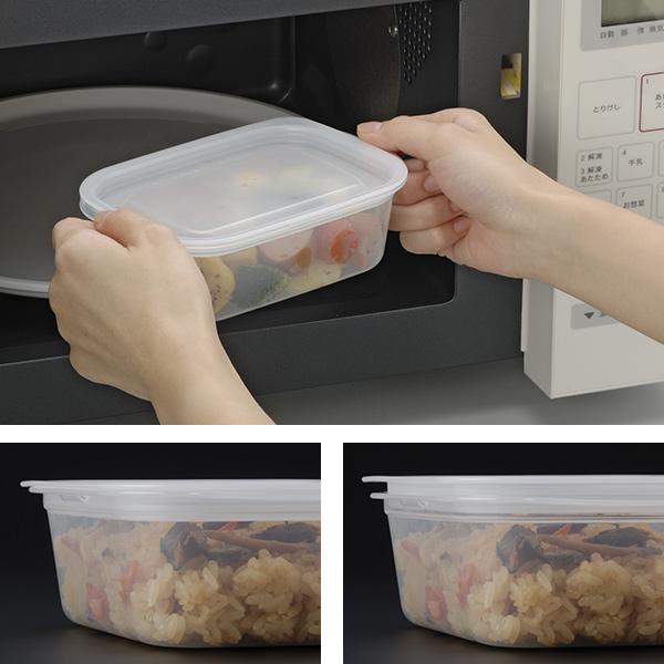 加熱時に発生する蒸気がフタを押し上げ、自動的に本体の溝から蒸気を逃すので、冷蔵・冷凍庫から取り出し、フタをしたまま電子レンジで温めることができます。