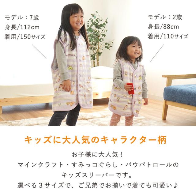 | ・キッズに大人気のキャラクター柄 お子様に大人気の、マインクラフト・すみっコぐらし・パウパトロールのキッズスリーパーです。 なめらかでフワフワ、肌触りが気持ちいいミンクフリース生地。 袖のないベスト型だから、着替えがしやすいだけでなく動きやすいのが嬉しいポイントです。 汚れても安心 おうちで洗えます!ネットに入れてご家庭の洗濯機でお洗濯OK! | |