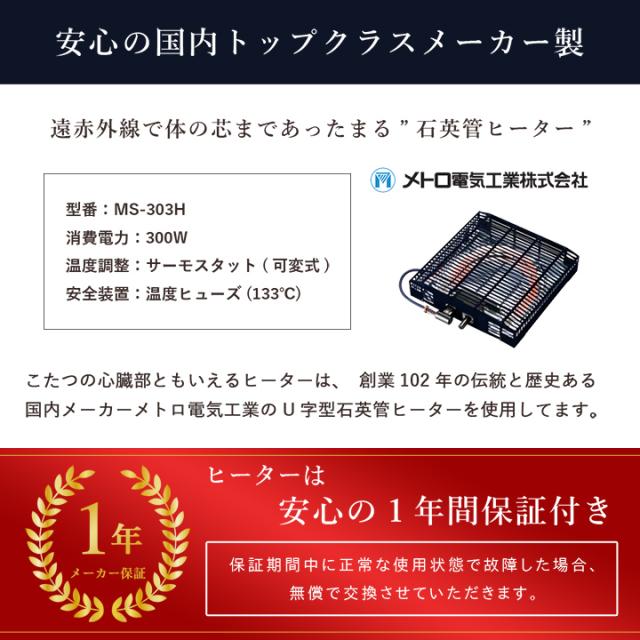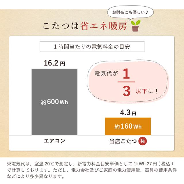 | ※付属の取り扱い説明書を必ずお読みの上ご使用ください。 ※こちらの商品につきまして、商品の特性上ご注文後の返品・交換はお受け致しかねます。あらかじめご了承ください。 ※こたつ台は海外ではご使用になれません。変圧器をご使用いただいた場合でもご使用になれません。 ※画面上のカラーはご使用ブラウザやモニターの設定により、実物とは若干異なる場合がございます。あらかじめご了承の上、ご注文をお願いいたします。 ※ふとんをやぐらの中に押し込んだり、座イスやイス全体をこたつの中に入れたまま使用しないでください。ふとんがヒーターに当たらないようにご使用ください。(火災の原因になります)ご使用により、ふとんが焦げた場合につきましては、返品・交換を承ることができませんので、あらかじめご了承ください。 |