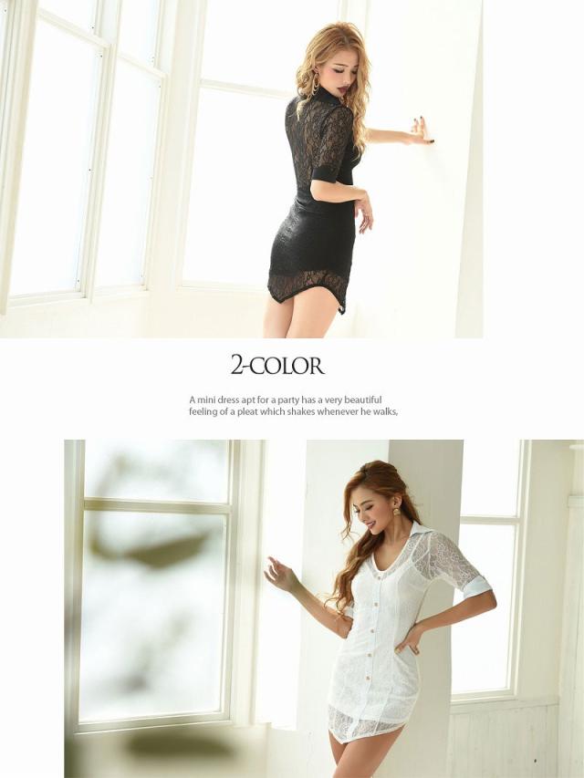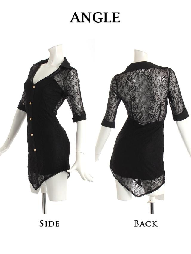 ☆おしゃれな襟付きデザインの袖付きドレスはシースルーミニタイトスカートが色気UPのアシンメトリードレス♪