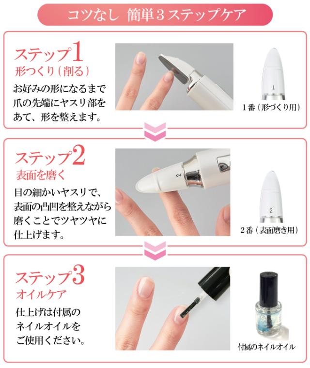 電動だからスピーディー!ピカピカ輝くツヤ爪に!お好みの形になるまで爪の先端にヤスリ部をあて形を整えます。磨き用のヘッドで表面を磨いてツヤツヤに仕上げます。仕上げは付属のネイルオイルをご使用ください。特殊加工のガラス製ヘッドは水洗い可能なので衛生的です。[品番]GN-059[商品サイズ(約)]190×28×30mm[商品重量(約)]62g[電源]単3形アルカリ乾電池1本使用(乾電池別売)[材質]本体/ABS樹脂、ヘッド(ヤスリ部分)/特殊加工強化ガラス[生産国]中国[保証期間]1年間