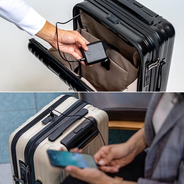 - トラベル用途よりも重い荷物を入れていますが問題なく半年以上使えています。個人的にはもうワンサイズ大きくても良いですが、スマートに使うにはちょうど良い容量かと思います。キャスターが静音設計だったり自分で交換出来るところも購入の決め手です。重量物を入れているせいかもしれませんが、特色あるキャスターの設計のためか、重心が高くなりがちで若干ふらつきやすいかもしれません。上部にある充電用のUSBですが、繋げるモバイルバッテリーの方もタイプAです。メイン収納は開くと左右両方にファスナーカバーがあるので、開けた拍子に荷物が崩れる心配もありません。フロントポケット内には書類用や小物用ポケットも付いてます。引き続き愛用させていただきます。