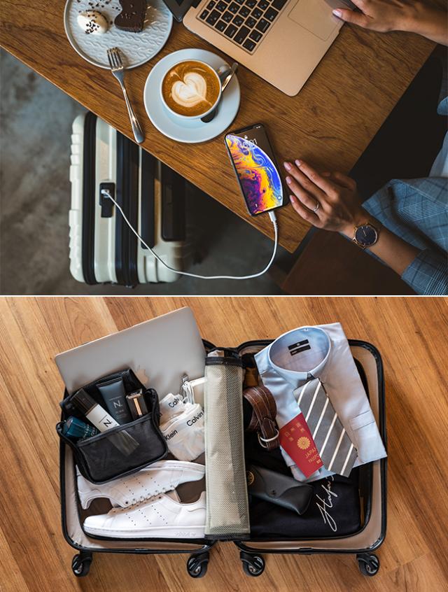 本体上部には2つのUSBポートを装備しています。フロントポケットルーム内にUSBポートとモバイルバッテリーを繋ぐケーブルが装備されていますのでそちらにセットしてください。待ち時間に作業しながらスマホとノートパソコンを充電したり、2人でシェアしたりも可能です。(※モバイルバッテリー、充電ケーブルは本製品には付属しておりません。お持ちのモバイルバッテリーがご利用いただけます。ノートパソコンを充電される場合は対応のモバイルバッテリーをご用意ください。)