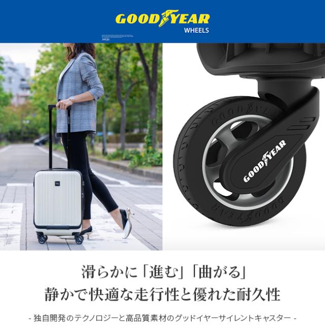 スーツケースの心臓部とも言えるキャスターは、破損のリスクや修理の件数の最も多いパーツの一つです。これまでスーツケースを使用していて、不満やトラブルを抱えた事はありませんか?「グッドイヤーホイール」はそれらの問題を解決するために開発されました。独自のテクノロジーと高品質の素材により、従来のキャスターよりもロードノイズを軽減しています。早朝の出発時や深夜の帰宅も安心です。キャスターは消耗品のため使用する度に性能が低下します。グッドイヤーホイールは車輪にかかる負担を軽減させ、従来のキャスターに比べて耐久性を向上させて、タイヤの性能が長く保たれるように設計されています。