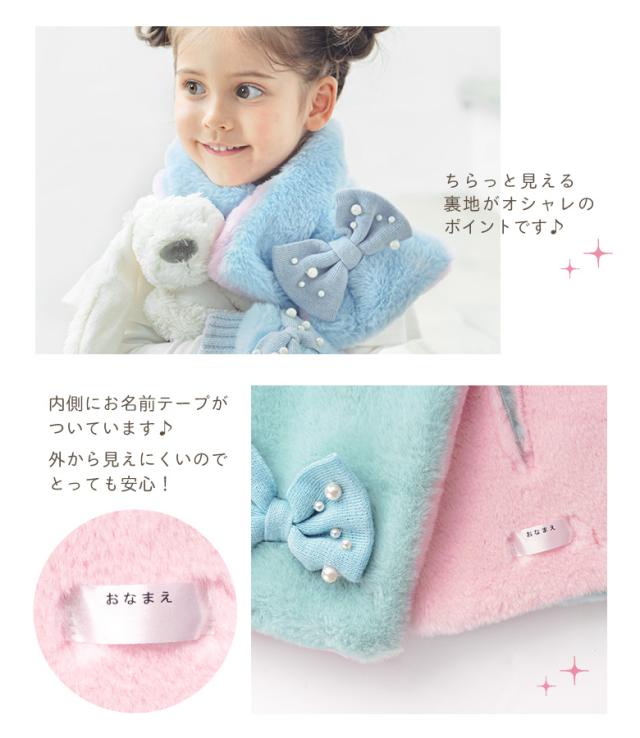 - 娘がウールのマフラーを「チクチクする」と嫌がるようになり、肌触りの良いものを探していました。ふわふわの肌触りと、娘好みの色・デザインは満足しています。 改善希望な点は以下4つです。 着用時に「お名前テープ」がついている部分がめくれてしまい、名前丸見えになってしまうこと。 穴に通して交差させている部分(リボンがついてる側)が、着用していると後ろに回ってしまうこと。 リボンについていた装飾のパールの縫い付けがあまりに心もとなく縫い直したので、もう少ししっかり縫い付けてほしい。 5才小柄の娘でも苦しいということがあり、もう少し長さにゆとりがほしい。 以上です。