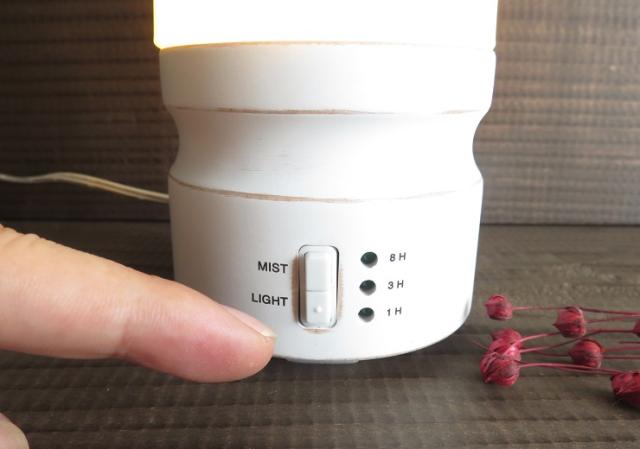 ライトボタン(下)を押せば点灯→減灯→明減と点灯モードが変わり、ミストボタン(上)を押すとお好みで1時間(連続運転),3時間(断続運転),8時間(断続運転)の運転モードをご選択いただけます。 |