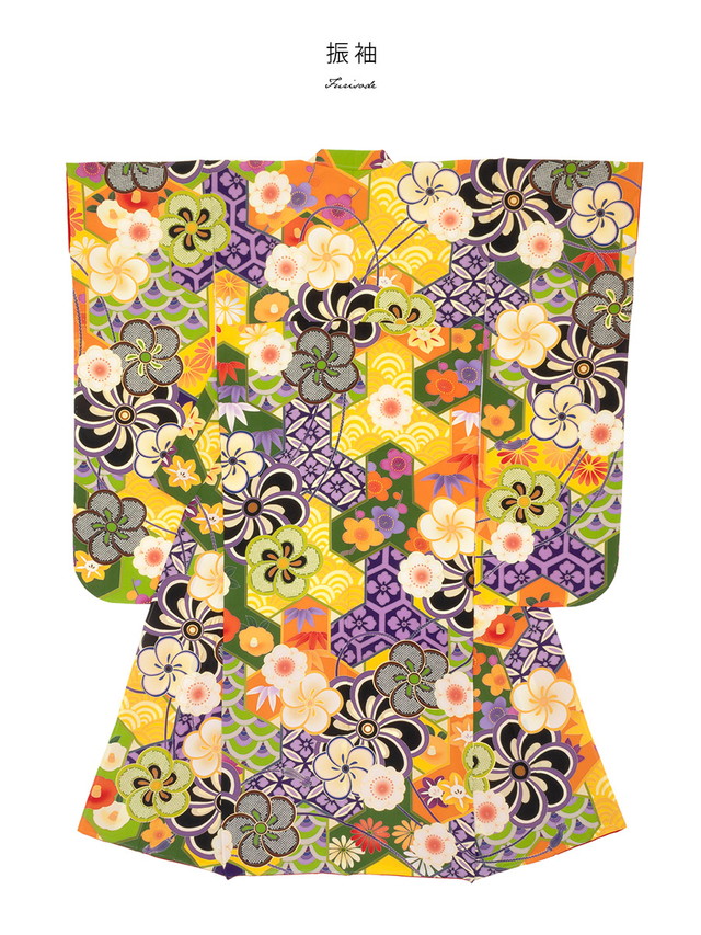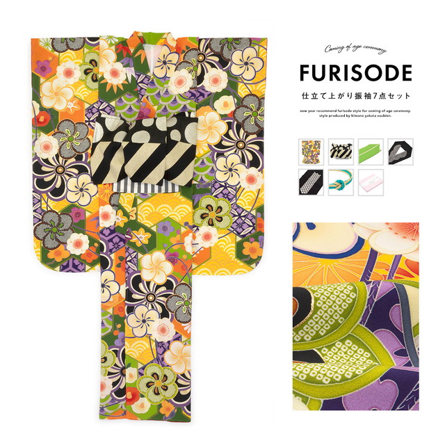 振袖セット カラフル 緑 グリーン 黄色 梅 椿 桜 花菱亀甲 昆沙門 絵羽柄 正絹 パールトーン 振り袖 ふりそで 着物セット 成人式 結婚式 日本製