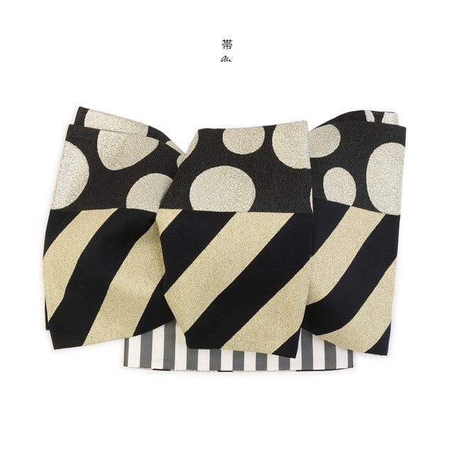 六通柄の袋帯はブランド『和風館』で、輝かしい金色糸でストライプと水玉がモダンなデザインです。