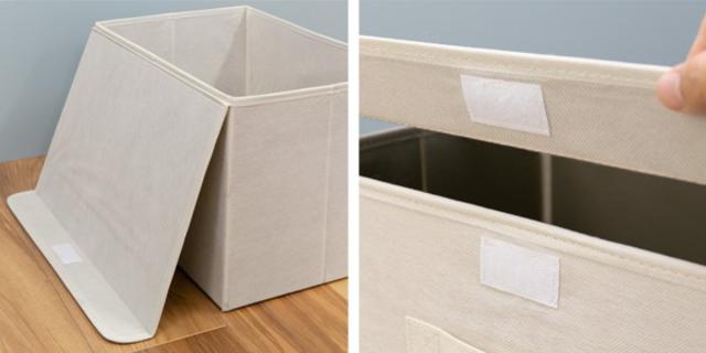 面ファスナー付きで、しっかりフタを閉められます。見せたくない物を隠して収納できます。