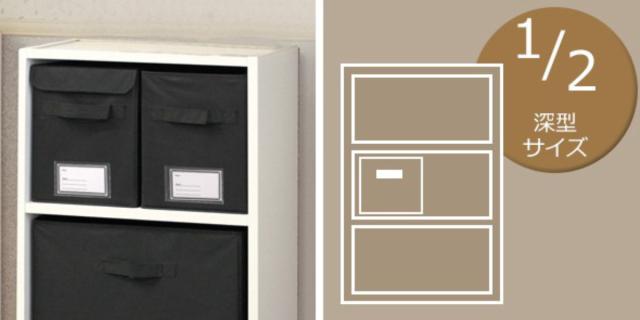 市販のカラーボックス半分にぴったり収まるハーフサイズです。深さがあるので効率よく収納できます。