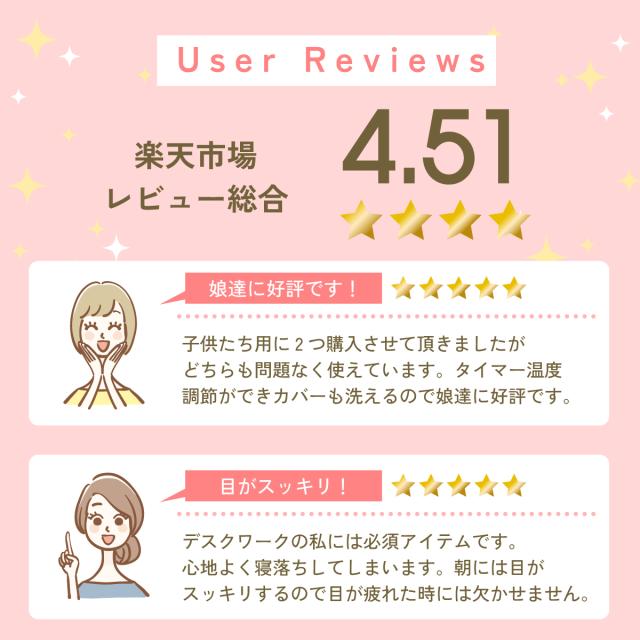 - ホットアイマスクをしようしていましたか゛ 買い続けるにはお金がかかると思い探していたこちらの商品に辿り着きました♪ 着け心地も暖かさもコードの長さもちょうど良く購入して良かったです!