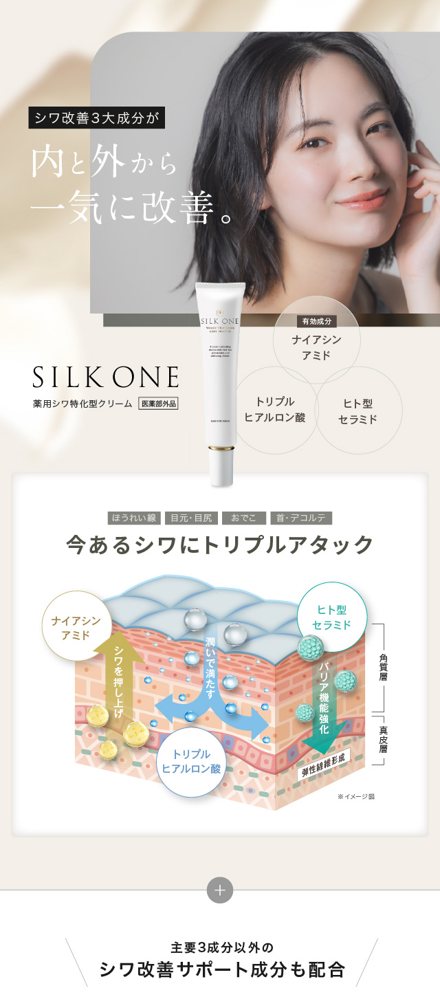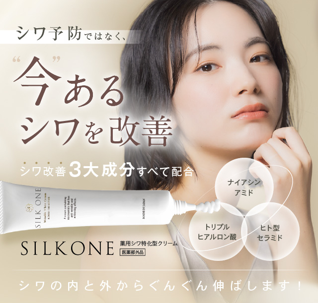 シワ改善 シワ取り シワ消し シワ伸ばし クリーム シルクワン SILKONE 顔のシワ ほうれい線 おでこ 額 目元 目尻 口元 首 デコルテ マリオネットライン 眉間 改善 解消 医薬部外品 黒ずみ 美白 クマ リフトアップ リンクルクリーム ナイアシンアミド トリプルヒアルロン酸 セラミド3 ヒト型セラミド しわ シワ 最強 皴 皺 ランキング
