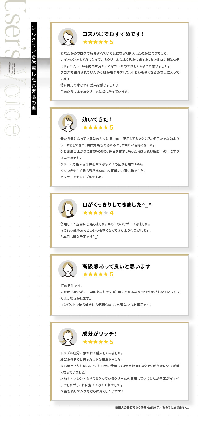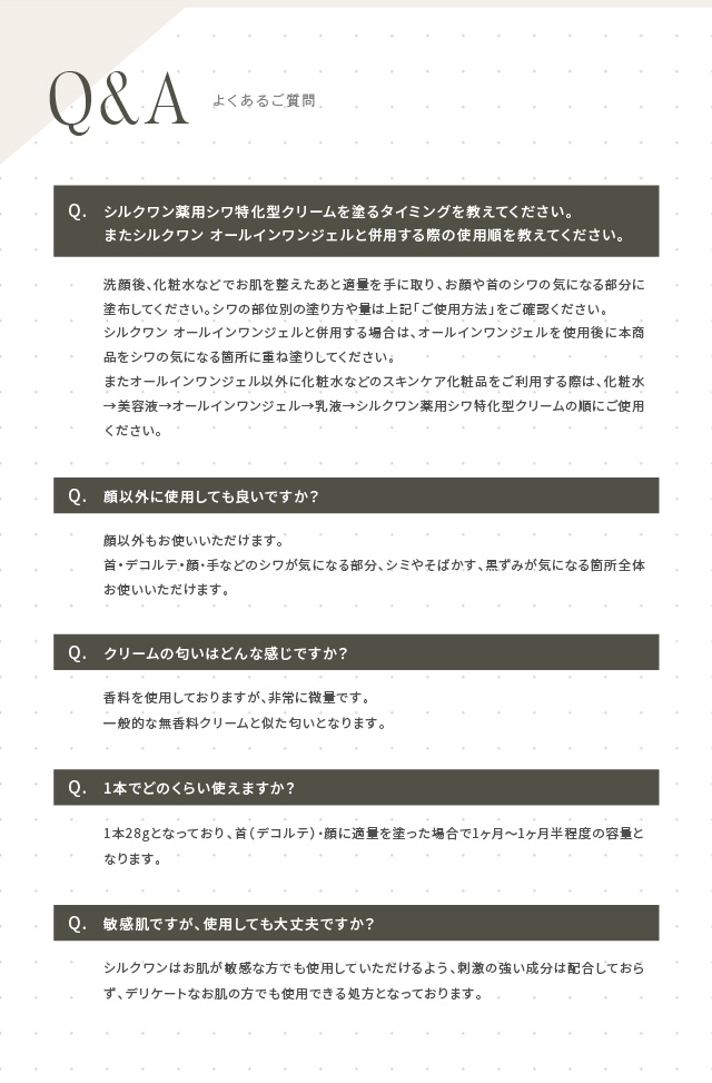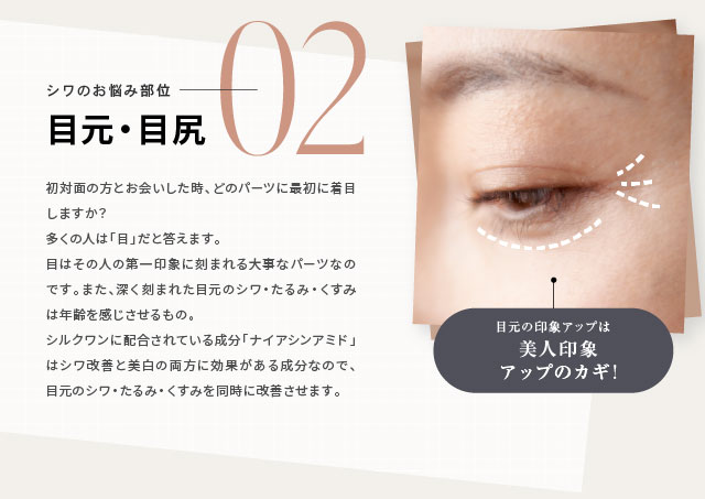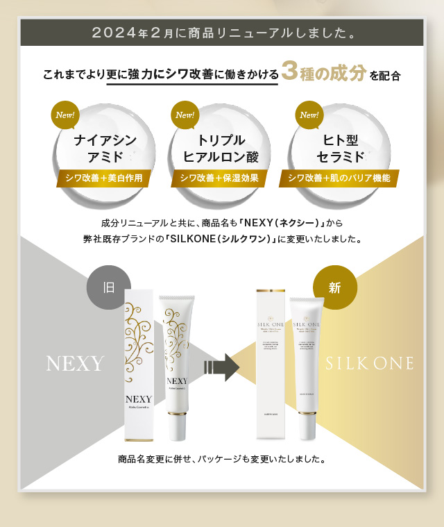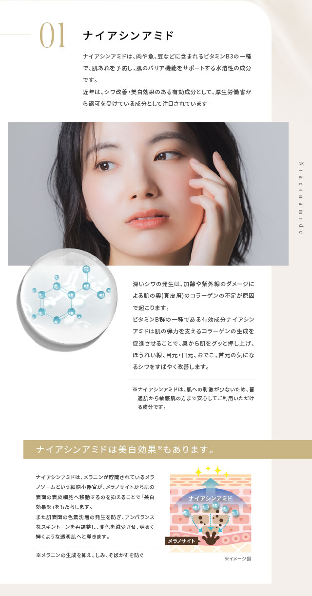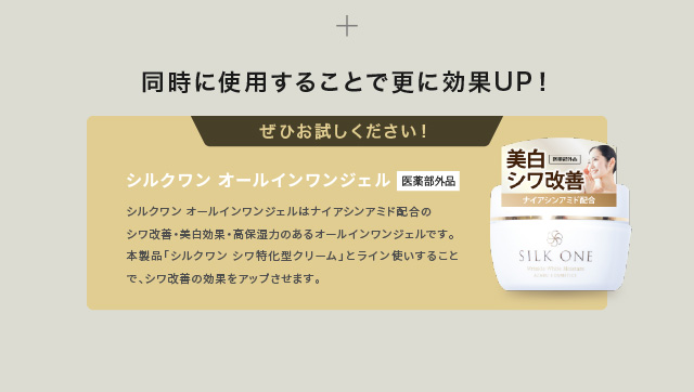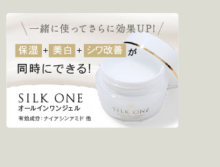 ●「シワ改善」と「美白」両方に効果のある成分、ナイアシンアミドを配合。同シリーズのオールインワンジェル「シルクワン」と併用して更に効果アップ。