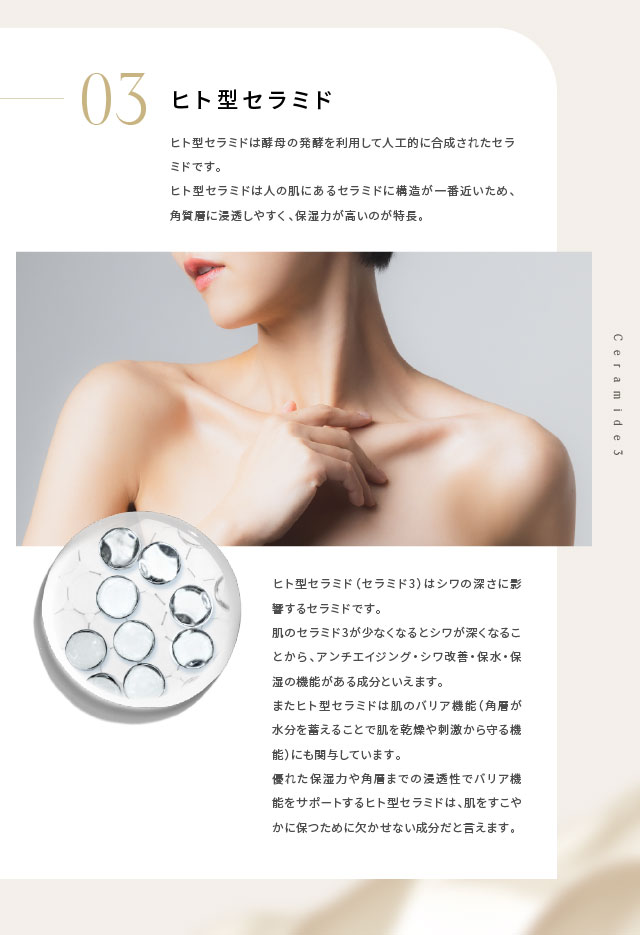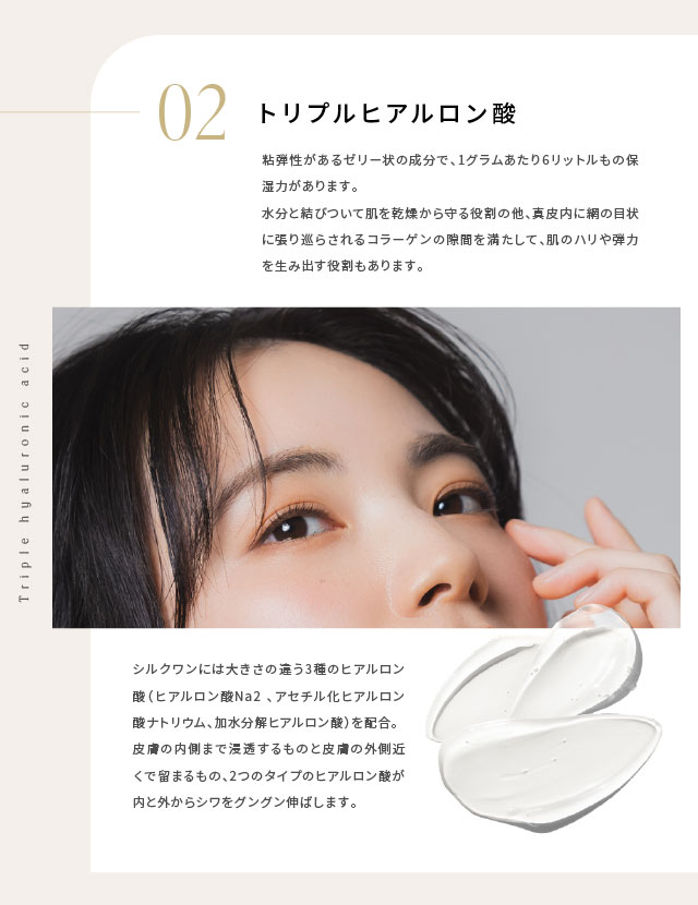 ●シワ改善の有効成分ナイアシンアミドとトリプルヒアルロン酸、ヒト型セラミドがシワの内と外からアタック。シワ改善のサポート成分としてコラーゲン、メリッサエキス、海藻エキスも配合。