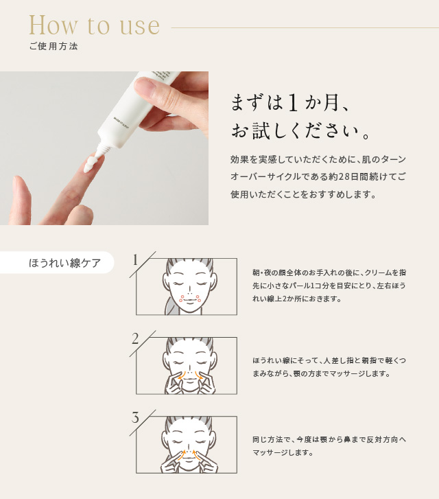 ●シワ改善だけではなく、保湿成分もしっかり配合。使い心地の良いクリームです。【保湿成分】シア脂、オリーブ油、スクワラン、黒砂糖エキス