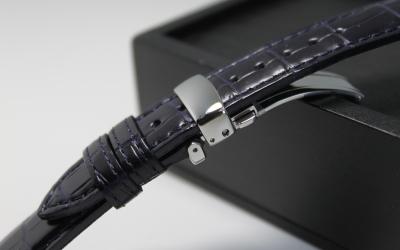 バンドは、4mm厚の最高級クロコダイル革を使った濃紺オイルマット仕上のハンドメイドです。ステンレススチールのバックルも素晴らしいクオリティー感と耐久性です!プッシュ式3つ折れ中留で簡単に取り外しができ、装着時には腕からの落下を完全に防止します。ビジネスシーンにもプライベートにもぴったりな仕上がりとなっています。