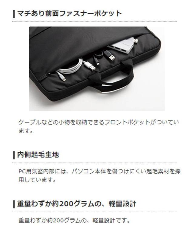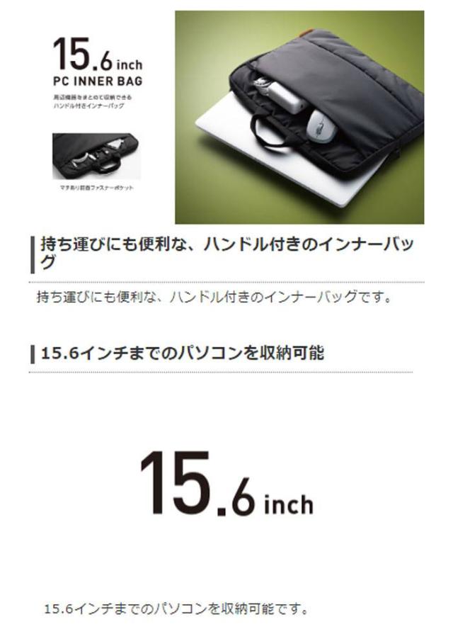 持ち運びにも便利な、ハンドル付きのインナーバッグです。15.6インチまでのパソコンを収納可能です。ケーブルなどの小物を収納できるフロントポケットがついています。PC用気室内部には、パソコン本体を傷つけにくい起毛素材を採用しています。重量わずか約200グラムの、軽量設計です。