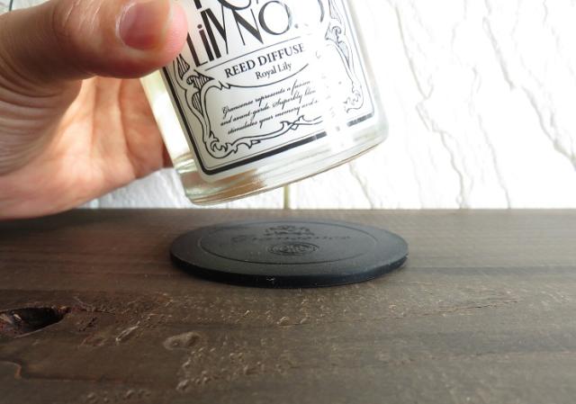 ディフューザーにはシリコン製の黒のコースターが附属しています。リード、キャップ、コースターと黒に統一され、高級感とバランスのとれたアイテムです。 |