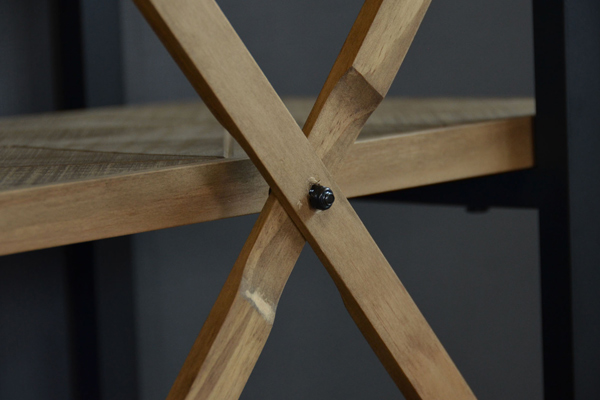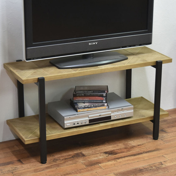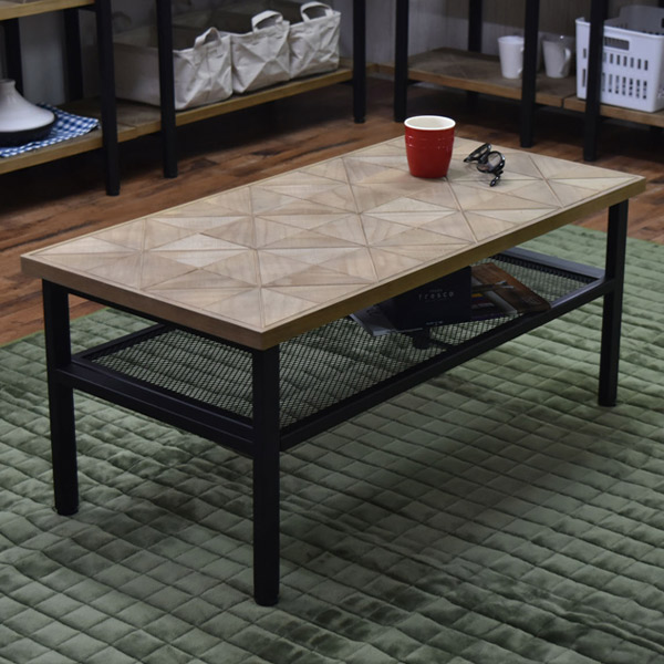 三角形にカットした古材風のパイン材をジオメトリック(幾何学模様)に並べた、おしゃれな棚板が特徴的な3段ラックです。脚には無骨なブラックアイアンを組み合わせ、デザイン全体を引き締めています。