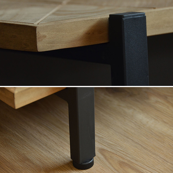 パイプ部はマットな手触りのエポキシ粉体塗装で仕上げているため、無骨で存在感があります。脚先にはアジャスターが付いており、ガタツキの微調節が可能です。