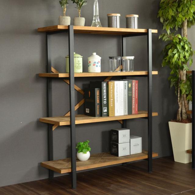 三角形にカットした古材風のパイン材をジオメトリック(幾何学模様)に並べた、おしゃれな棚板が特徴的な4段ラックです。脚には無骨なブラックアイアンを組み合わせ、デザイン全体を引き締めています。