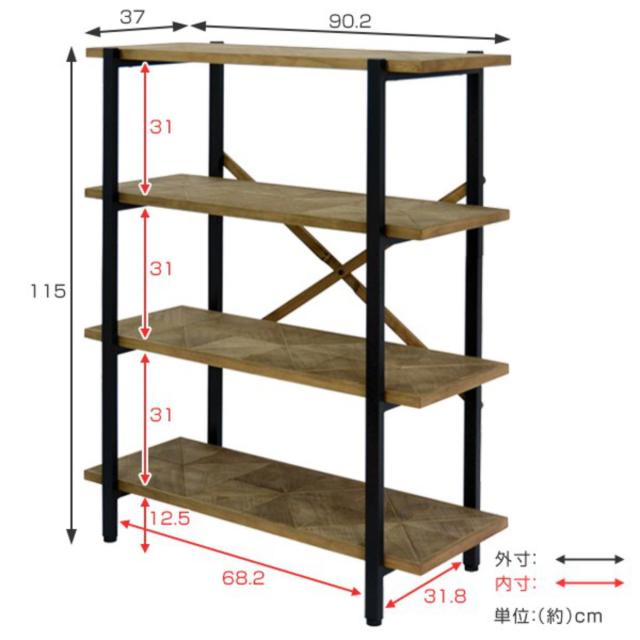 オープンラック 幅90cm 4段 組木 古材風 KALEIDO ( 本棚 収納棚 収納ラック シェルフ フリーラック アイアンシェルフ ラック オープンシェルフ 飾り棚 棚 リビング収納 家具 おしゃれ 収納 木目 木製 一人暮らし 約幅90 )
