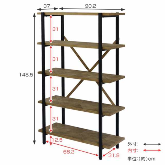 オープンラック 幅90cm 5段 組木 古材風 KALEIDO ( 本棚 収納棚 収納ラック シェルフ フリーラック アイアンシェルフ ラック オープンシェルフ 飾り棚 棚 リビング収納 家具 おしゃれ 収納 木目 木製 一人暮らし 約幅90 )