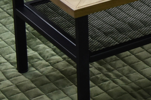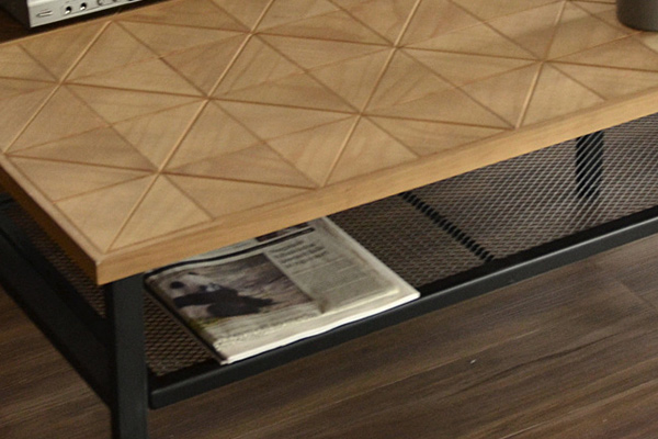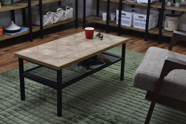 幾何学模様の古材風パーツが特徴的なセンターテーブル