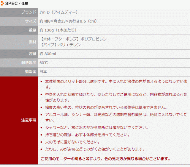 I'm D(アイムディー) RETTO(レットー)ディスペンサーL 単品容量は800mlと大容量なので、あらゆる詰め替えパックに対応してくれます。