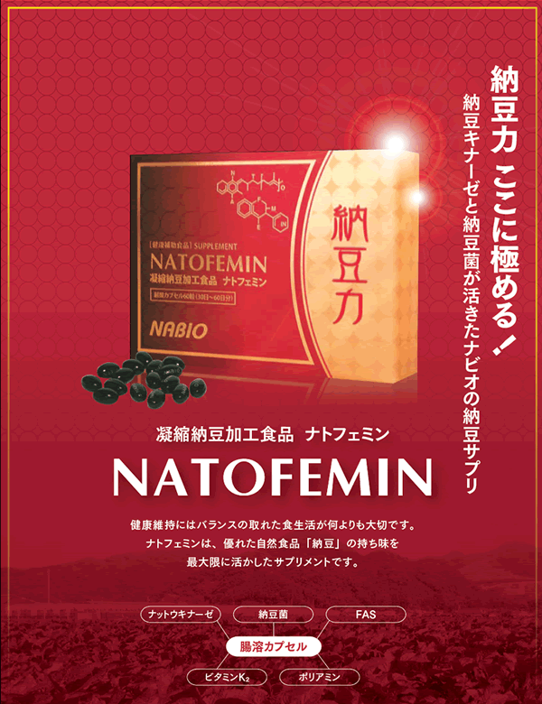 ナトフェミンは、納豆菌の生み出す成分を凝縮して作られた製品です。