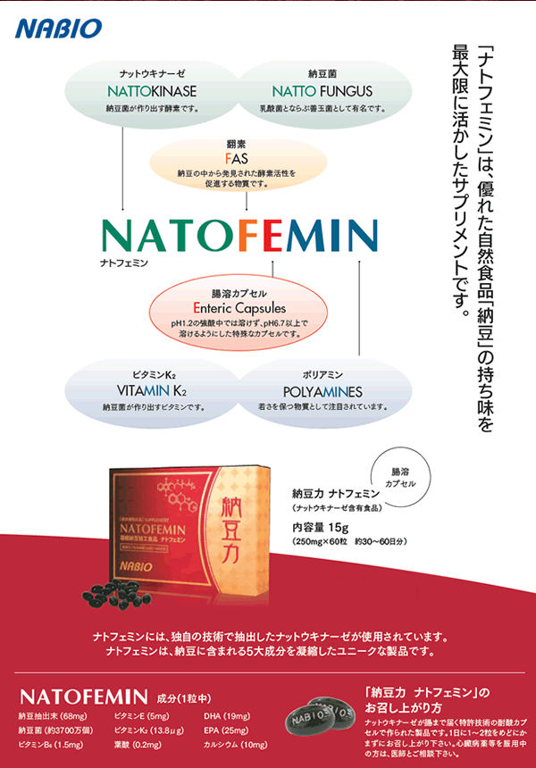 | ナトフェミンは、納豆のネバネバ部分をもとに作られていますが、 少量の大豆成分も混入しています。 大豆アレルギーのある方は、お召し上がりはお控え下さい。 |