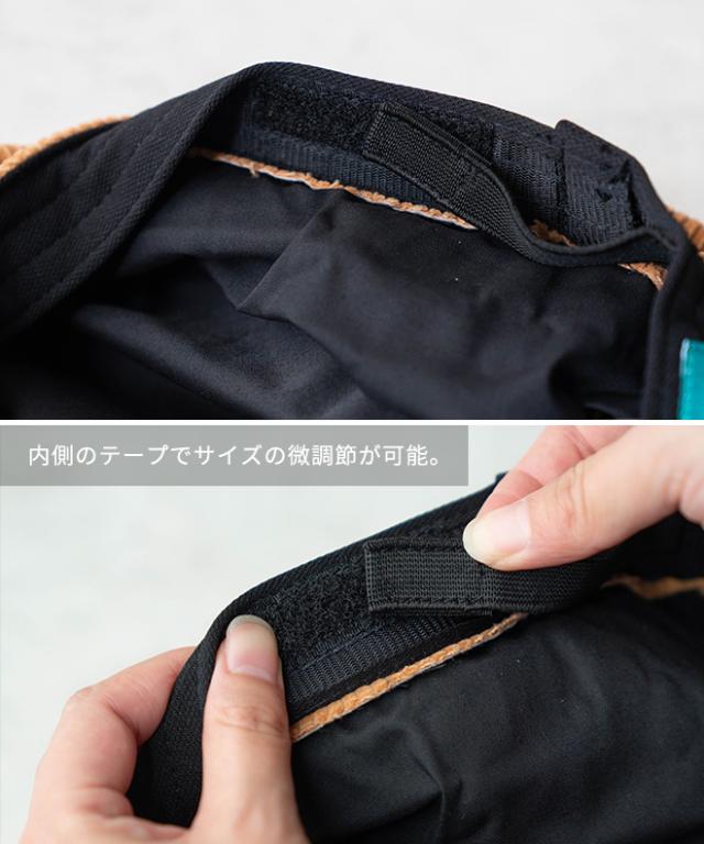 ●大きめサイズで頭周り約59cmまで対応。アジャスターベルト付きでサイズ調節可能。