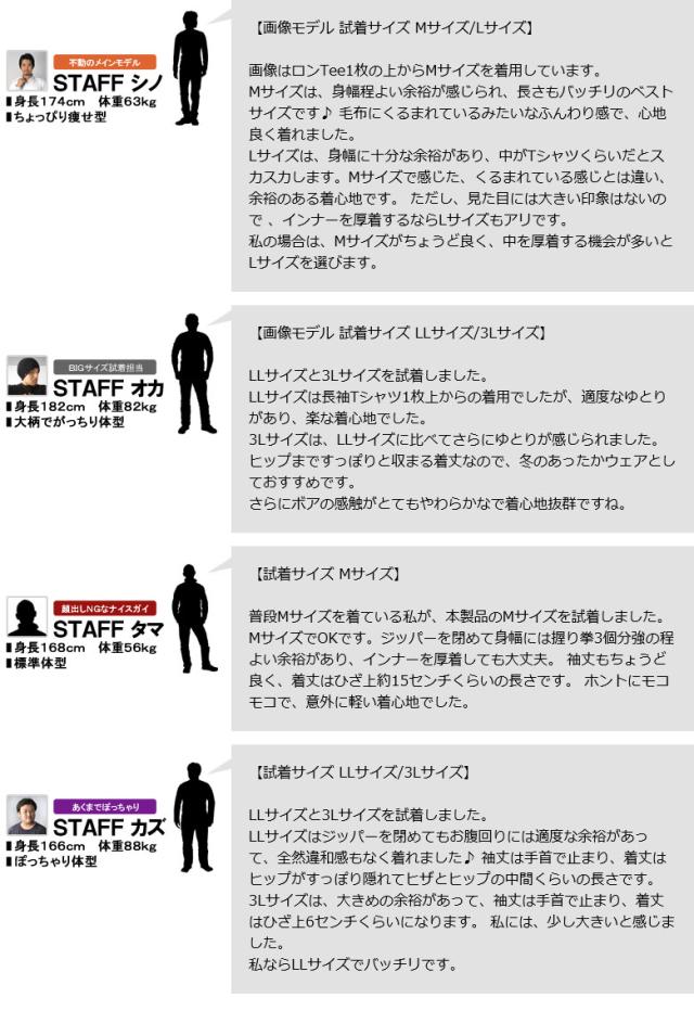 - 174cm、100kgの筋肉質の主人。なかなか体に合う服がありません。自宅で寒い寒いと言うので、何とかしようと思い、探したところ。3Lがあり、早速注文。ファスナーもはまり、本当に喜んでいました。丈も長...