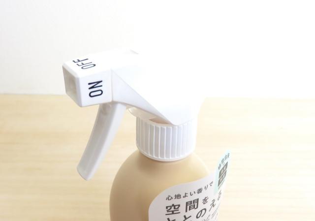 淡いベージュのボトルにON/OFF付きスプレー部は白色にしたツートーンカラー。お部屋に出したままでも可愛く映えるデザイン。
