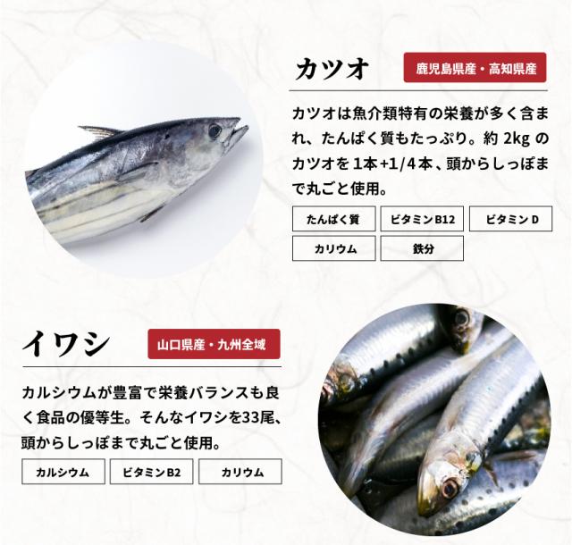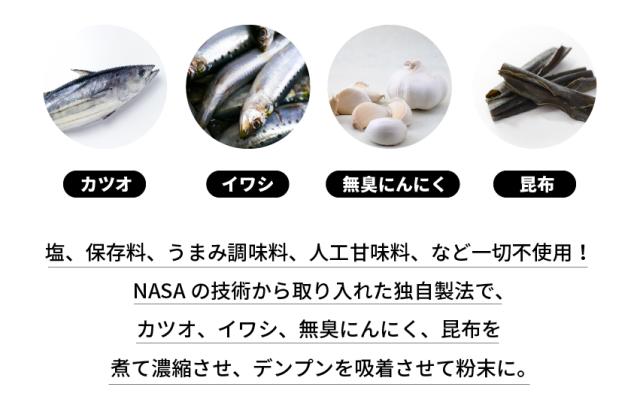 | 原材料 | カツオ、イワシ、無臭ニンニク、コンブ、デンプン(キャッサバ由来) |