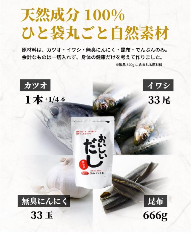 素材をまるごとペプチド状に!いつものお料理にサッと一振りで手軽においしいだしがつくれます。塩分、添加物一切不使用の無添加自然食品です。真空、圧力、ろ過の自然現象を基にした独自の方法で製造し、素材の味を壊さず天然素材本来の旨みがいっぱい詰まっています。原料は国産のイワシ、カツオ、昆布、無臭ニンニクをまるごと使用しております。イワシやカツオは頭から骨、内臓、目玉まで全て使用し、化学処理を一切加えずにアミノ酸を低分子状態のペプチドにしました。お味噌汁やお鍋のだしや、和、洋、中問わずにご使用いただけます。時間のない時でもお湯に溶かすだけで美味しい栄養スープにもなります。アレルギー27品目や食塩、酵母エキス等の添加物は一切不使用の為、お子様の離乳食からお年寄りの方のお食事のサポートまで幅広くご利用頂けます。美容や健康を気にしている方にもオススメです。 【内容量】500g×3個 【原材料】カツオ、イワシ、無臭ニンニク、コンブ、デンプン(キャッサバ由来) 【生産国】日本