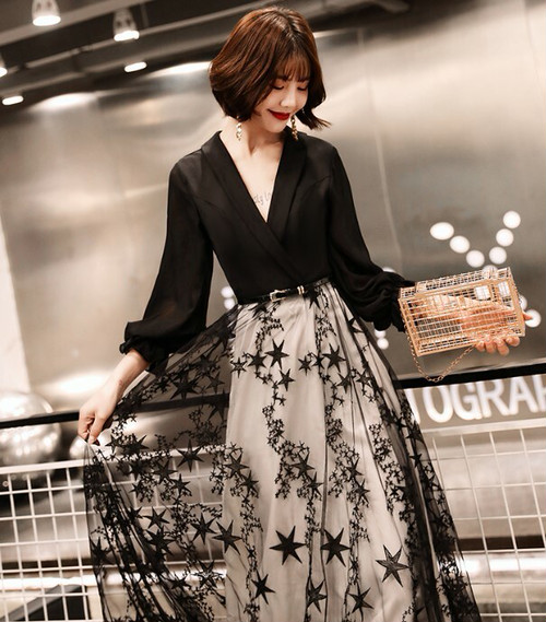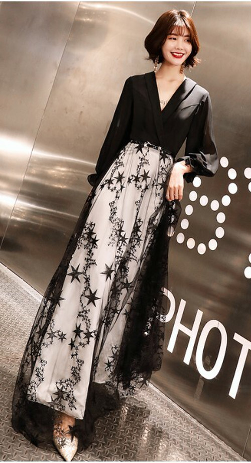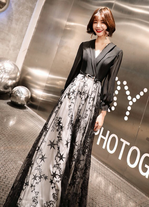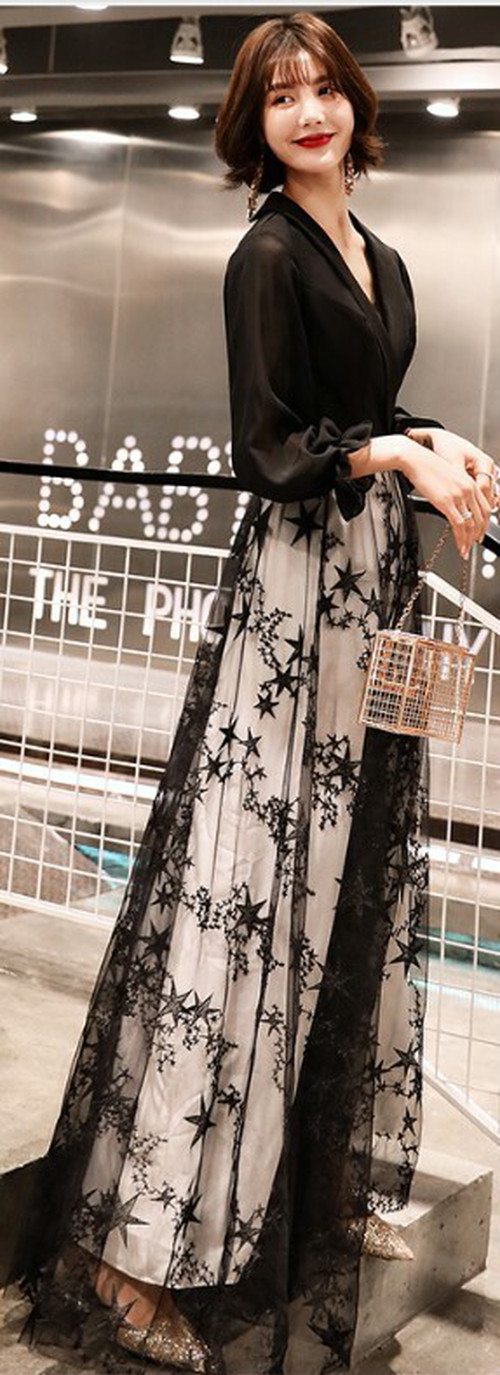 ブラックだけどチュール素材で重くなりすぎないよう、抜け感をプラスした上品ドレス。