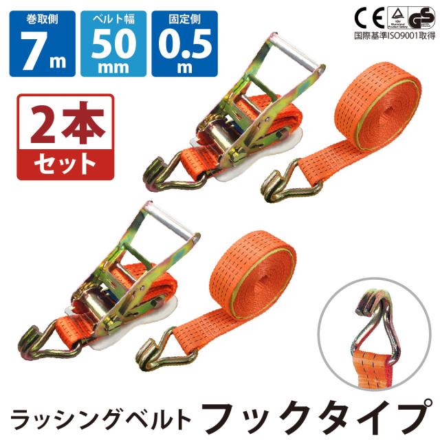 ラッシングベルト ガチャガチャ ラチェット式 バックル式 2本セット Jフック 幅50mm 固定側0.5m 巻側7m 工具 作業