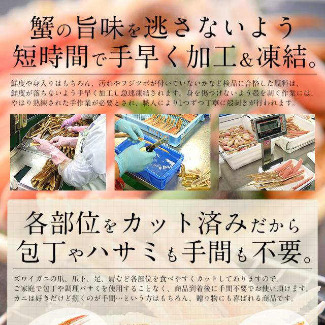 ズワイガニ ポーション ずわいがに しゃぶしゃぶ 刺身 ズワイガニ むき身 ズワイガニポーション かに カニ 蟹 刺身OKの高鮮度!食べやすくカット済みでお刺身やカニ鍋、しゃぶしゃぶ、焼き蟹などいろいろな調理方法でお召し上がり頂けます。