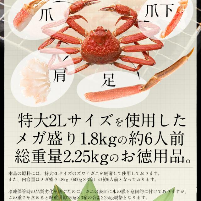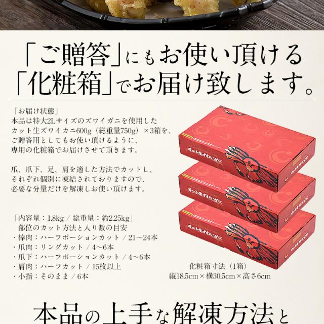 ズワイガニ むき身 ポーション お刺身OK 生 カット済み 1.8kg(600g×3箱/総重量2.25kg)かに カニ ずわい蟹 しゃぶしゃぶ 刺身 鍋 贈り物 kst23_d kst23_c ギフト プレゼント お歳暮