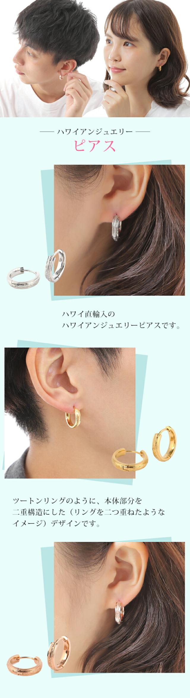 | 詳細 | リングで例えると、ハワイアンジュエリーの伝統的な造りの、ツートンリングのように、本体部分を二重構造にした(リングを二つ重ねたようなイメージ)デザインです。 医療用にも使われる、サージカルステンレス(ステンレス316L)を使用していますので、金属アレルギーの方にも、ほぼ安心してご利用いただけます。 自分の守り神として、大切な人と幸せを運んでくれる神様として、そんな願いを込めたジュエリーです。 このハワイアンジュエリーピアスのお色は3色展開です。 イエローゴールドカラーは、14金・18金が主流な中、あえてこだわって、高級な24金でメッキをしています。そのことで、ハワイアンジュエリーのピアスとしても、そして、金属アレルギーが起きにくく変色しにくいステンレスならではの特性を保つとともに、金本来の輝きをお楽しみいただけます。 ピンクゴールドカラーは、ピンクゴールドがもつ優しいピンクの色合いは、日本人の肌にとても相性が良いため、馴染みやすいです。女性に人気のイメージが強いピンクゴールドカラーのハワイアンジュエリーですが、近年ピンクゴールドを施したメンズ時計が増えたことにより、男性にも人気のあるカラーとなっております。 ステンレス素材のハワイアンジュエリーも最近増えてきましたが、専門店ならではの、こだわりのステンレス製のハワイアンジュエリーリング(指輪)、ハワイアンジュエリーバングル、ハワイアンジュエリーネックレスを扱っている当店でお買い求めいただけますと幸いです。 *両耳用です。 |