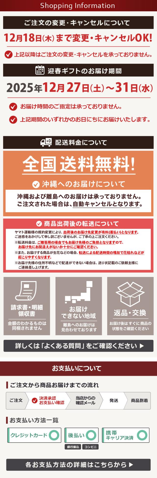 迎春特集商品は2025年12月27日(土)〜31日(水)のいずれかにお届けいたします。