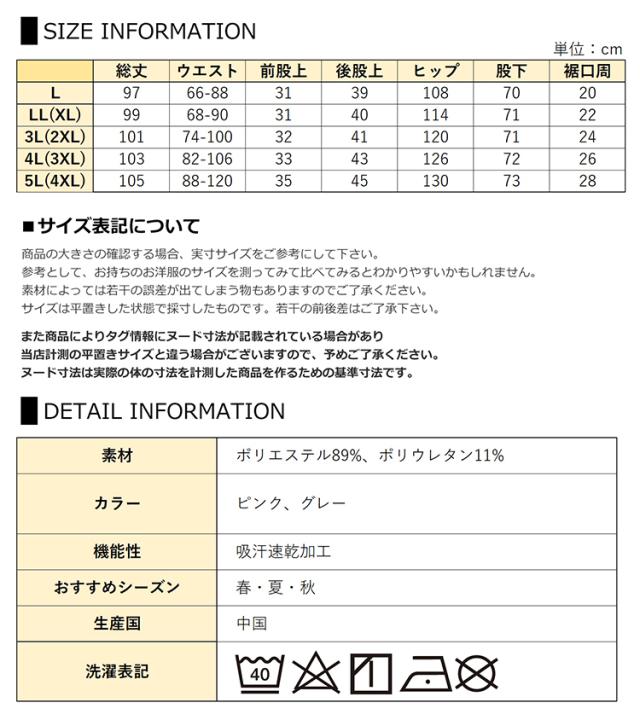 5L(4XL):総丈105 ウエスト88-120 前股上35 後股上45 ヒップ130 股下73 裾口周28