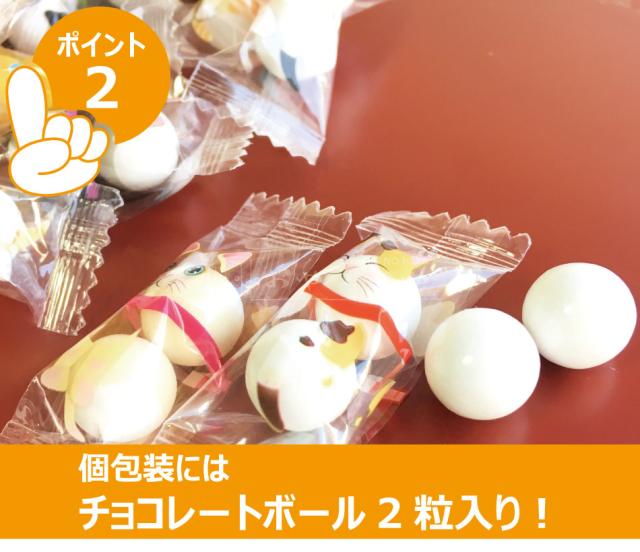 10種類の猫さんがプリントされた個包装に、直径13mmのチョコレートボールが2粒入っています。