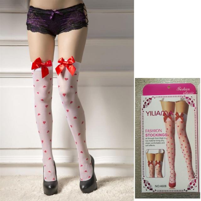 【即納】赤リボン付き ガーターストッキング 白 ハート柄 セクシー 美脚 デザインタイツ メイド ナース 制服 ゴスロリ ニーハイ サンタ コスプレ