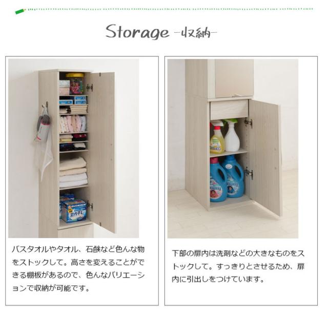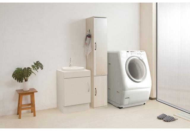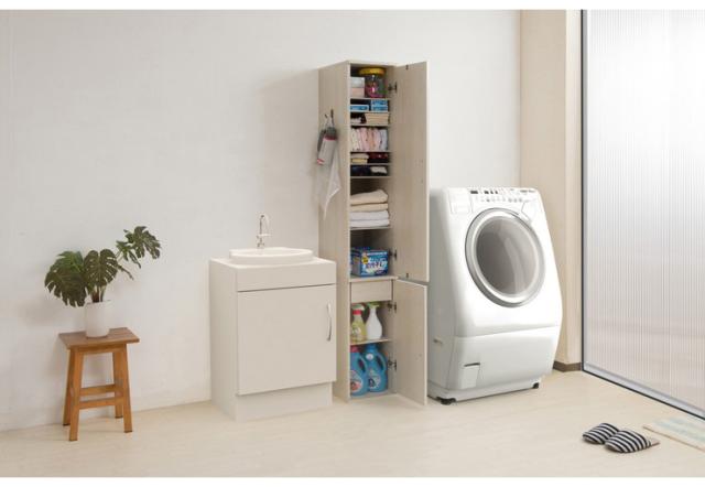全身ミラー付きですっきりとしたデザインは清潔感があって、サイズ感もうれしいスリム設計。着替えや洗剤などたっぷり収納できます。
