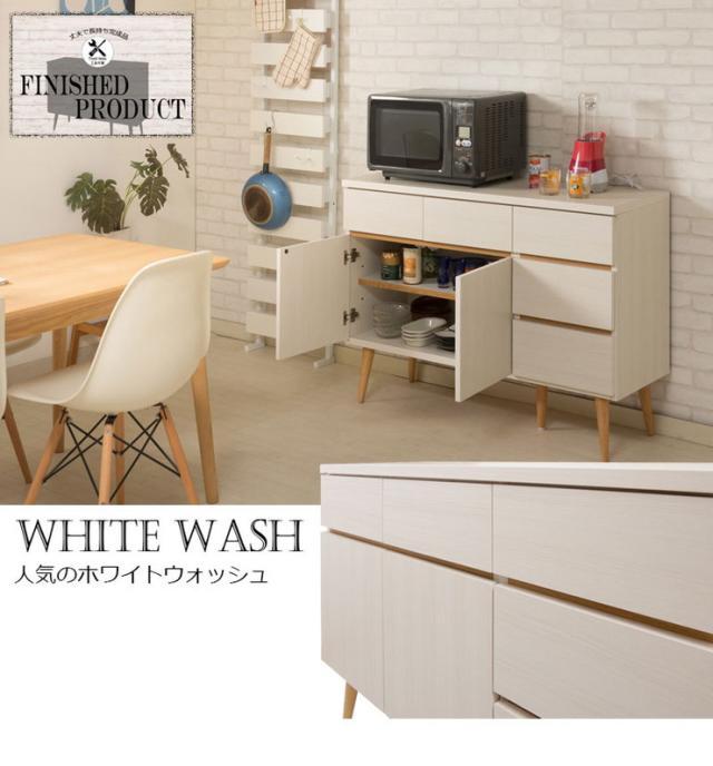 日本製 キッチンカウンター 幅110cm ホワイトウォッシュ 収納型タイプ 完成品 組み立て不要 レンジ台 レンジラック 食器棚(代引不可)【送