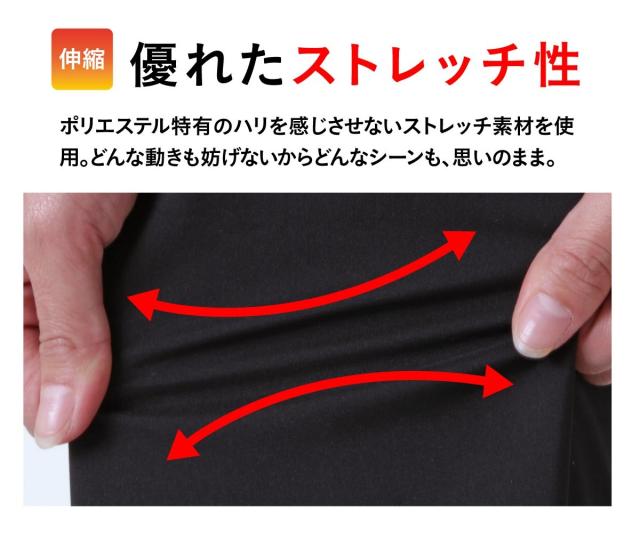 ポリエステル特有のハリを感じさせないストレット素材を使用。どんな動きも妨げないからどんなシーンも思いのまま。